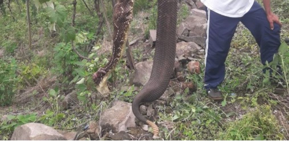 Ele diz que os funcionários penduraram o animal em um arame para ver a proporção do tamanho dela em relação às pessoas. A estimativa é que o animal tivesse mais de 5 kg, mas já estava bem menor, segundo o secretário. Para ele, é comum este tipo de serpente, já que entre 70% e 80% da área da cidade é composta por mata nativa, e o parreiral era muito próximo ao mato.