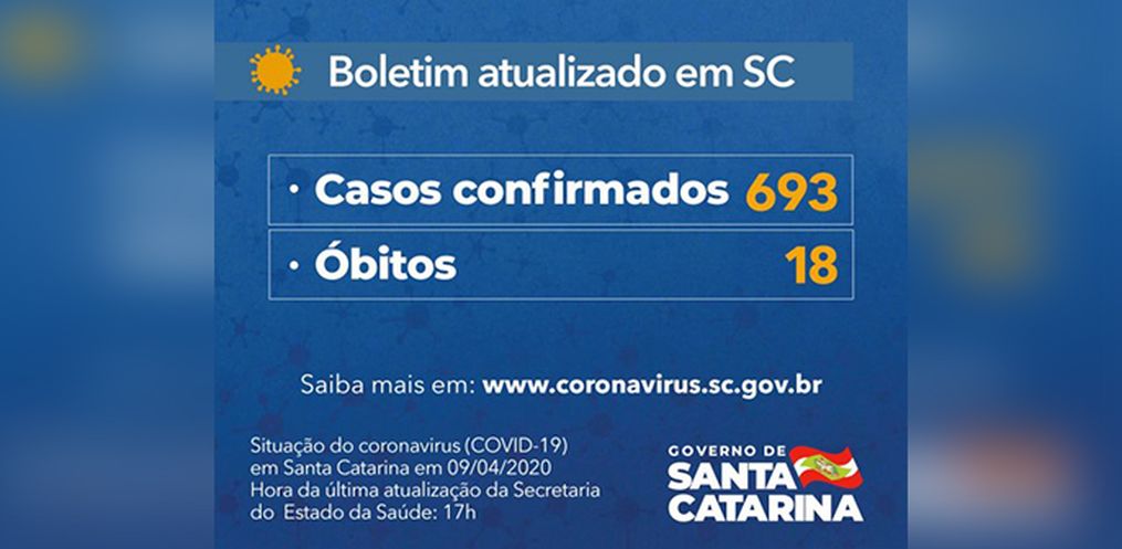 Santa Catarina chegou a 693 casos confirmados de pessoas com Covid-19 nesta quinta-feira, 9. O número representa um aumento de 38,3% em relação ao boletim anterior. Segundo o governador Carlos Moisés, esse acréscimo pode ser explicado pelo fato de o Governo passar a contabilizar também os casos confirmados por laboratórios privados. O governador também confirmou mais uma morte causada pelo novo coronavírus. Dessa forma, o total chegou a 18 em Santa Catarina.