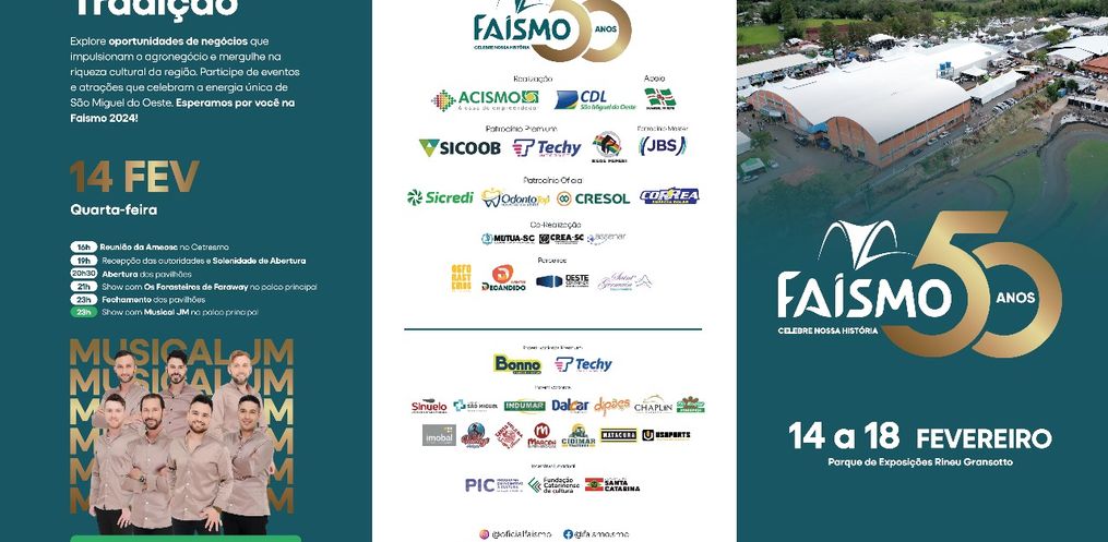 O coordenador da CCO, Cleomar Zacchi disse que a Faismo 2024 não é apenas uma celebração dos 50 anos da feira, mas também um reflexo do comprometimento em oferecer uma experiência memorável para todos que participam. “Estamos ansiosos para proporcionar momentos inesquecíveis de cultura, diversão e inovação", completou. A Faismo vai acontecer entre os dias 14 e 18 de fevereiro.