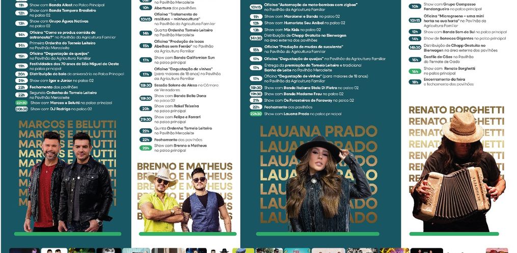 A Comissão Central Organizadora da Faismo divulgou, nesta sexta-feira, 03, a programação completa do evento. Neste ano, a feira marca os 50 anos da exposição e os 70 de emancipação de São Miguel do Oeste. A Faismo terá dois shows nacionais com Marcos e Belutti na quinta-feira, dia 15 de fevereiro, e Lauana Prado no sábado, dia 17. Não haverá cobrança de ingresso e os visitantes também não vai pagar pelo estacionamento dos veículos. A Faismo terá cerca de 310 estandes e mais de 270 empresas expositoras.