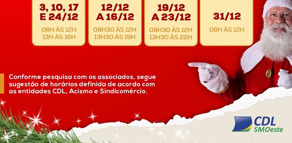 Ela citou que na semana que antecede o Natal, entre os dias 19 a 23, o atendimento será das 8h às 12h e das 13h às 22h. A Câmara de Dirigentes Lojistas de São Miguel do Oeste também fez sugestões para horário de trabalho na véspera de Natal e de Ano Novo, sendo que no dia 24, o horário deve ser das 8h30 às 12h e das 13h às 16h. Já no último dia do ano, o horário do comércio será apenas na parte da manhã, sendo entre 8h30 às 12h.
