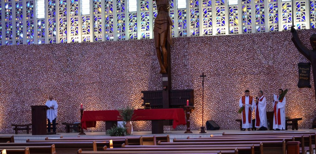 A celebração de Domingo de Ramos costuma lotar a igreja Matriz São Miguel Arcanjo. Mas, neste ano, no entanto, a igreja esteve com as portas fechae a missa foi transmitida através da Rádio Peperi.