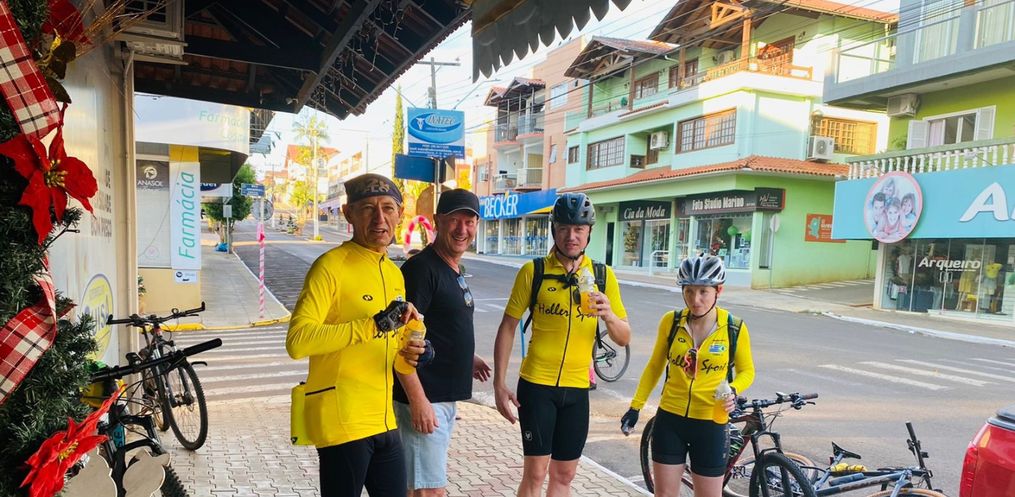 Um grupo de amigos ciclistas acompanhou os aventureiros até Itapiranga, onde fizeram uma parada para hidratação.