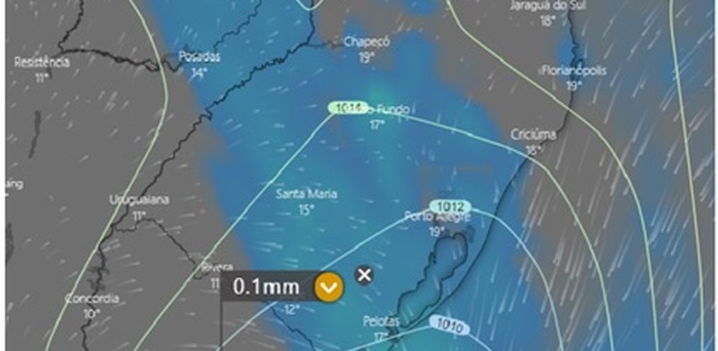 Sistema: alta pressão (massa de ar mais frio) com centro ao sul do Uruguai. Cavado no oeste da região Sul, favorecendo a entrada de umidade no leste de SC.