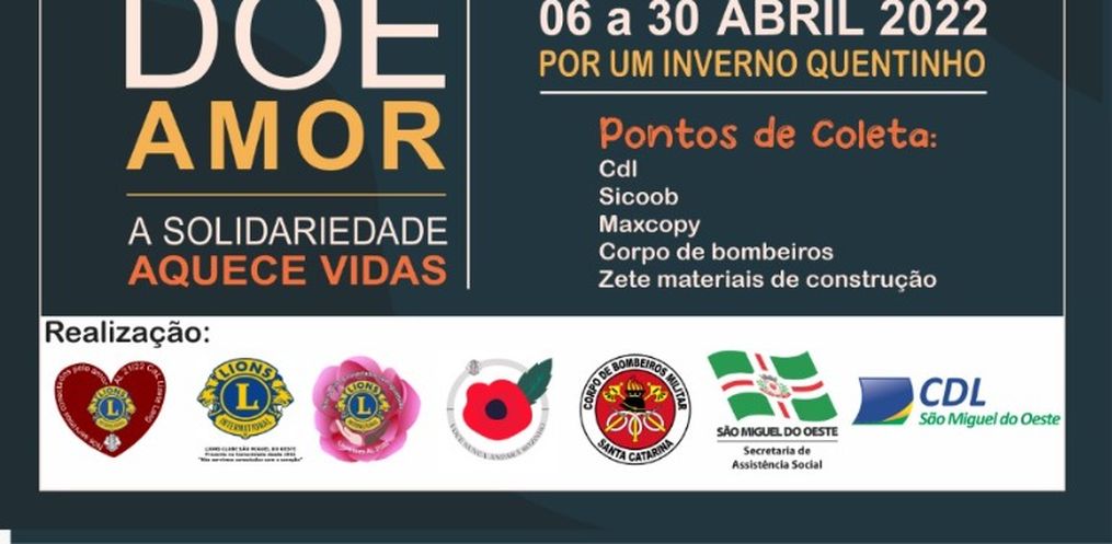 Neste ano, a campanha tem o nome de “Doe Amor: a solidariedade aquece vidas”. A promoção é do Lions Clube São Miguel Universidade com o apoio do Lions Clube São Miguel, Léo Clube, Corpo de Bombeiros, Prefeitura e CDL.