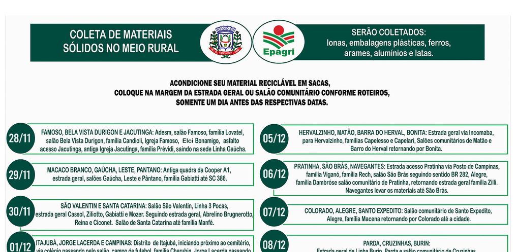 Segundo Zappani, a segunda coleta do ano vai começar na próxima segunda-feira, 28, se estendendo até o dia nove de dezembro. Ao todo, serão, duas semanas de recolhas em todo o interior de Descanso. Na oportunidade ao menos seis tipos de materiais serão recolhidos como por exemplo, lonas, ferros, arames, alumínio, embalagens plásticas e garrafas pet. Outros materiais sólidos que possam ser reciclados também serão recolhidos na coleta da semana que vem.