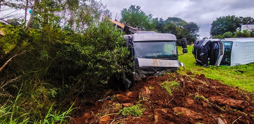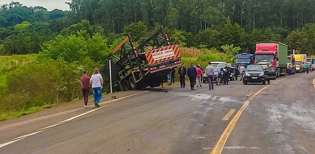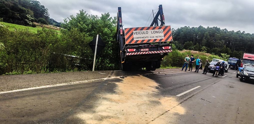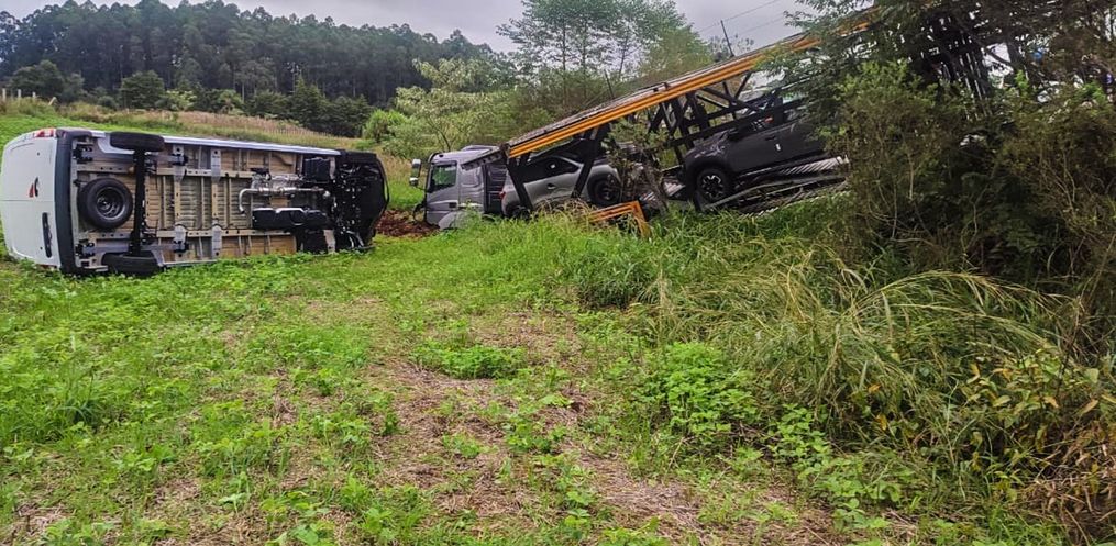 No momento da colisão a cegonha transportava veículos, que se desprenderam no momento da colisão. Alguns ficaram tombados.