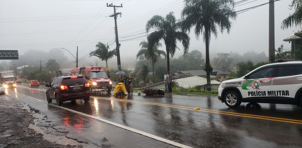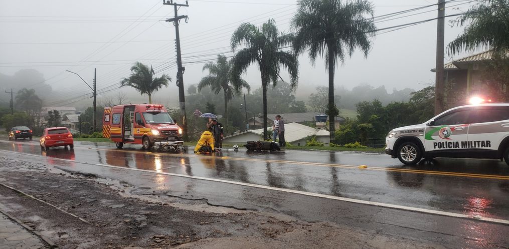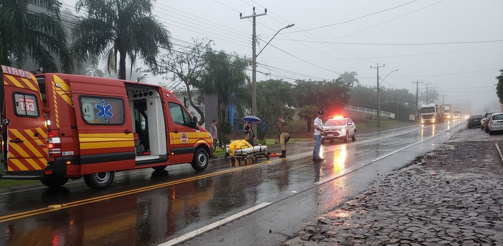 Após receber os primeiros socorros do Corpo de Bombeiros, o homem foi encaminhado ao Hospital Nossa Senhora das Mercês. Chovia forte no momento do acidente.