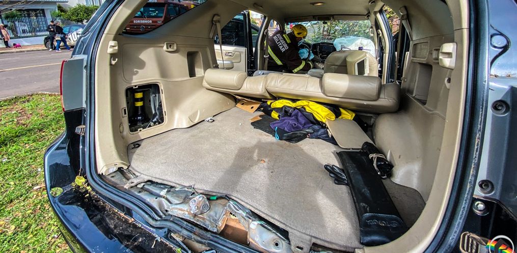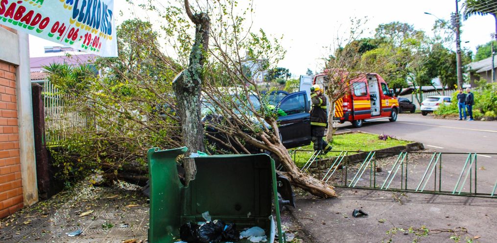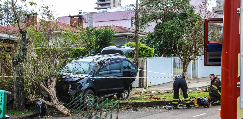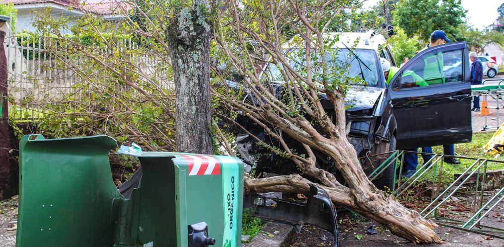 Uma saída de pista de uma Hilux SW4 com placas de São Miguel do Oeste, seguida de colisão em lixeira e árvore, deixou um homem ferido na rua Duque de Caxias, centro da cidade, proximidades do ginásio do Joni Gool.
