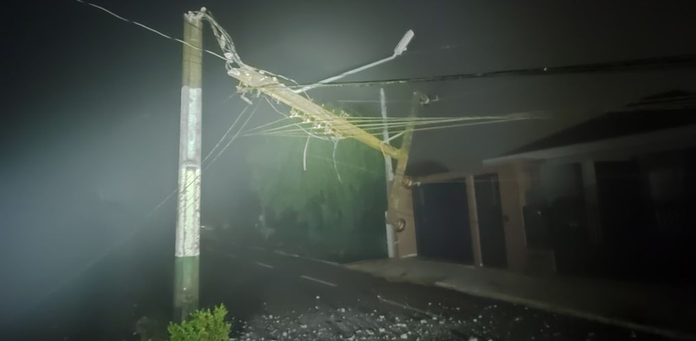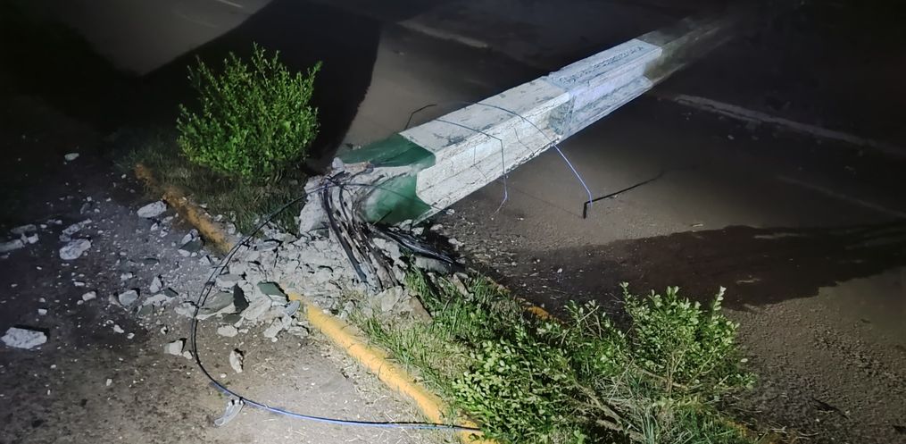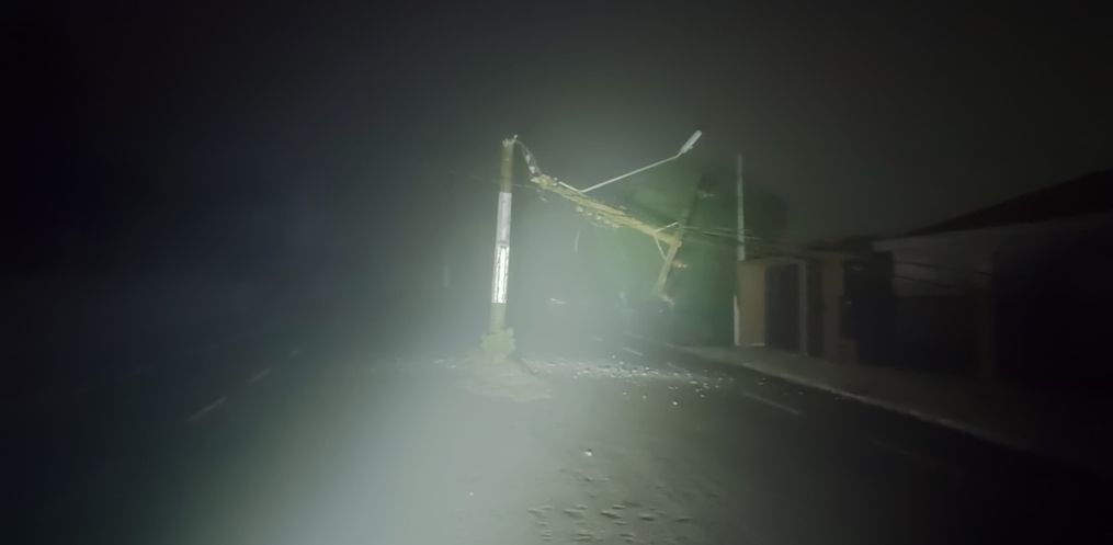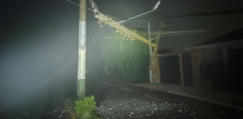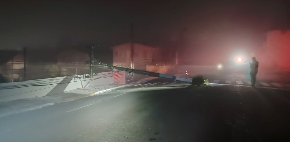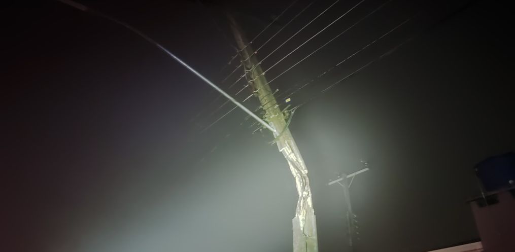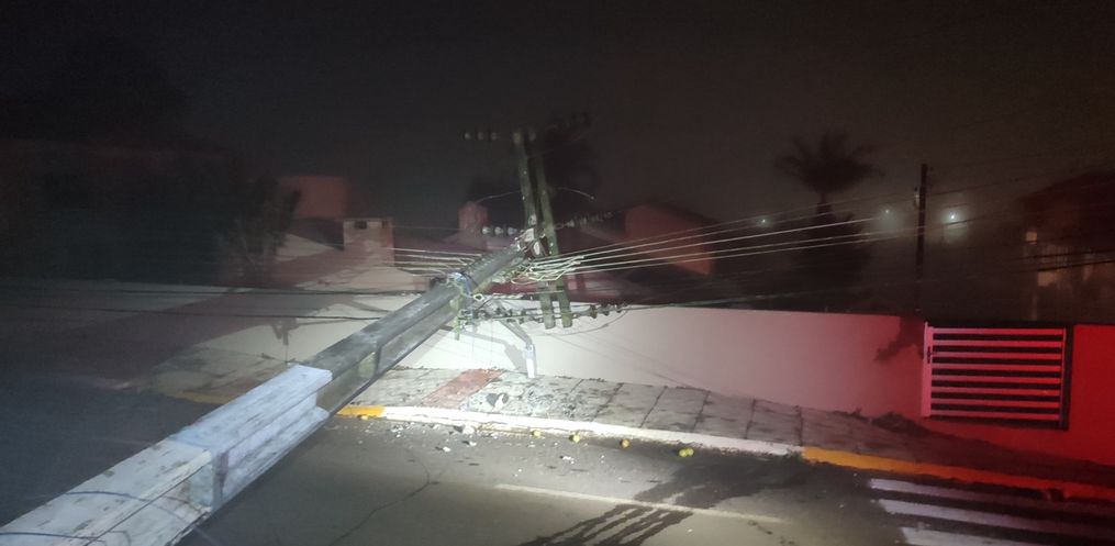 Com o impacto, o poste acabou caindo e ocasionando a quebra de outro poste que estava interligado pela fiação elétrica.