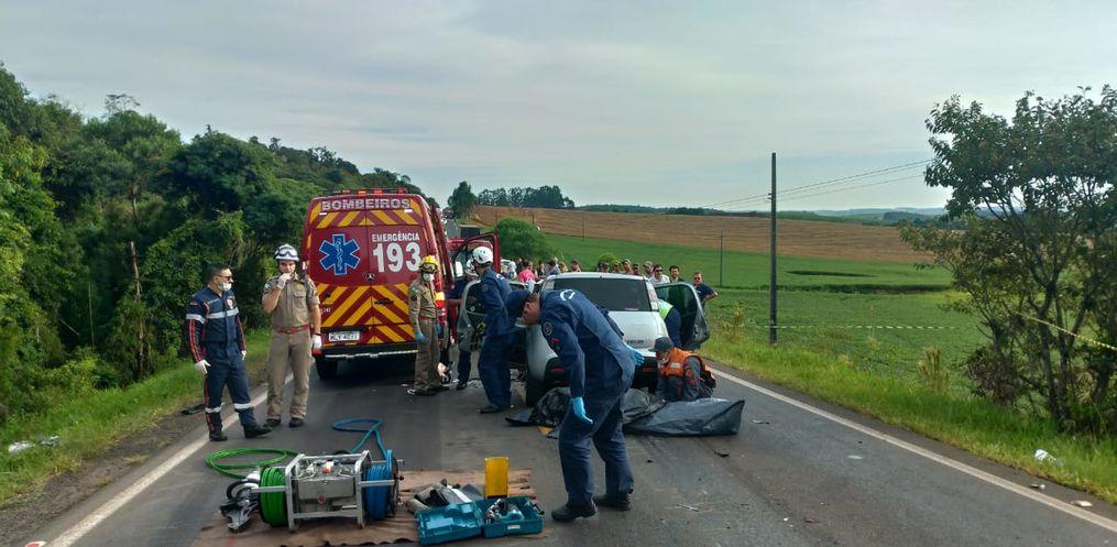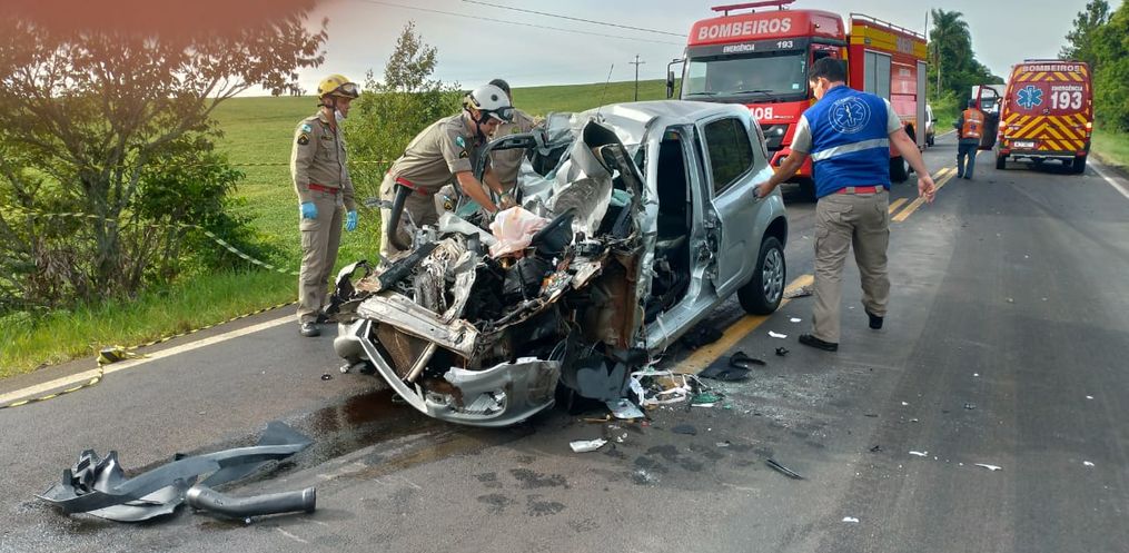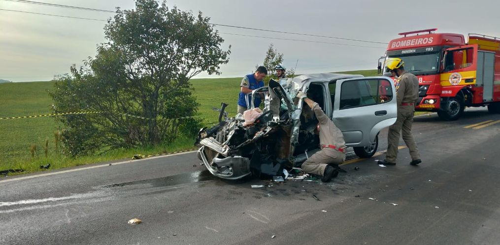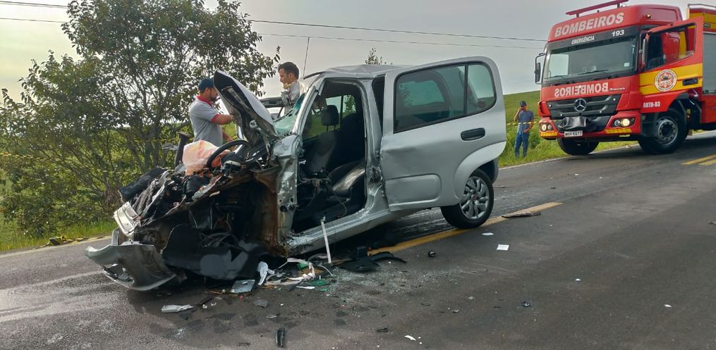 Segundo o Corpo de Bombeiros, o acidente envolveu um Fiat Uno, placas de Marialva/PR, e dois caminhões de São Lourenço do Oeste, um dirigido por um homem de 25 anos e outro de 35. O Uno era dirigido por uma mulher, de 51 anos. Os motoristas dos caminhões não sofreram ferimentos.