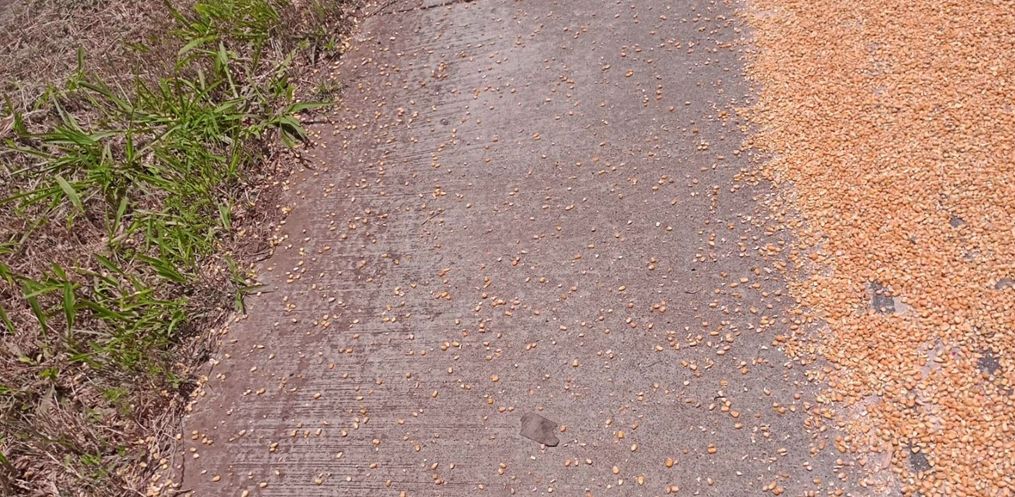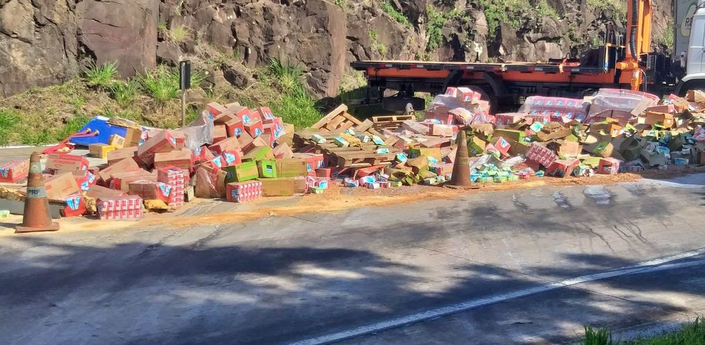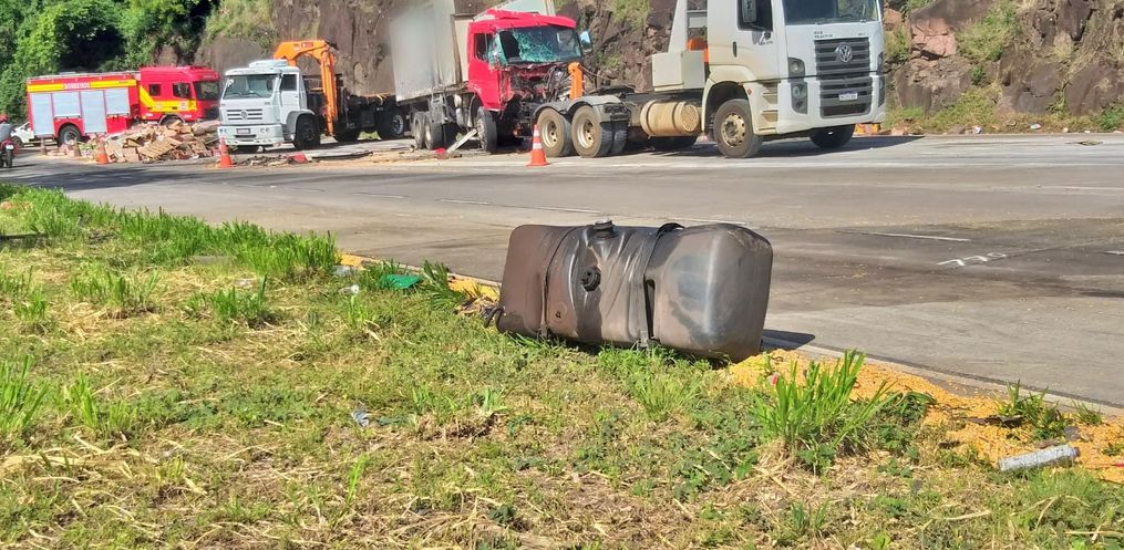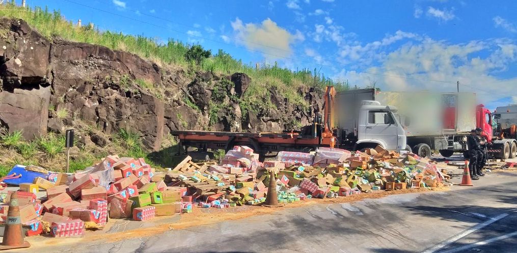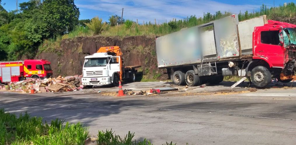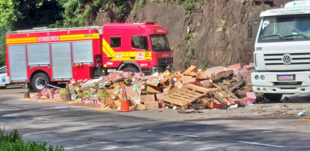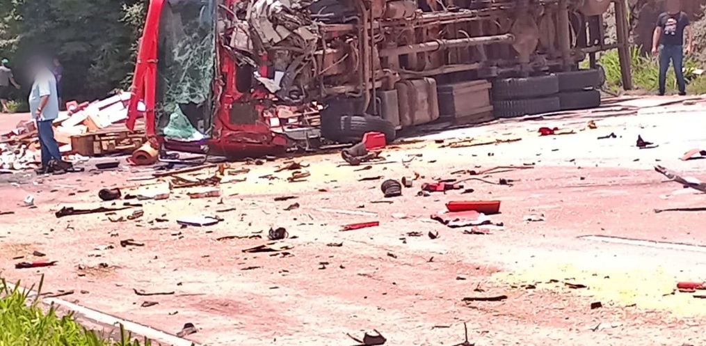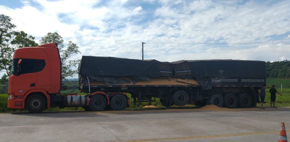 No local, confirmou-se a colisão envolvendo uma carreta Scania carregada com milho, um caminhão Mercedes Atego transportando caixas de leite e um VW Voyage. Três pessoas estavam envolvidas no acidente.
