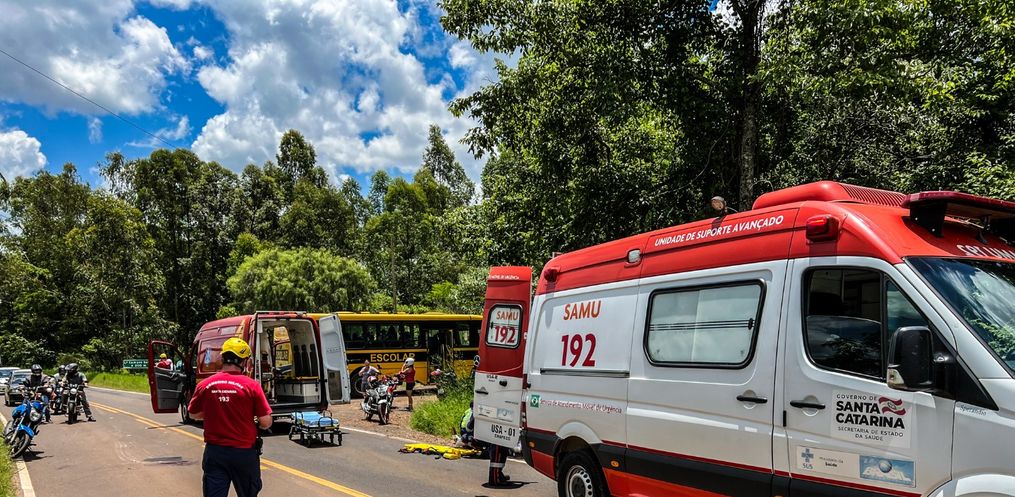 A colisão aconteceu na SC-492 por volta das 12h50. Segundo informações do condutor do caminhão, ele seguia sentido a Bandeirante, quando a motocicleta que vinha na direção oposta e que era ocupada por duas pessoas, ultrapassou um Ônibus e colidiu na lateral do veículo. Com o impacto, o condutor da moto e a caroneira, sofreram lesões graves.