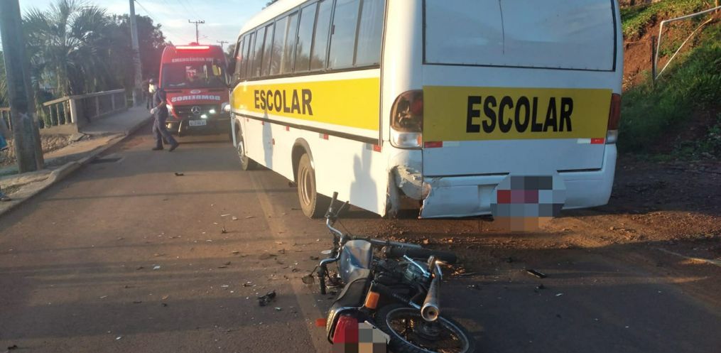 A colisão envolveu uma motocicleta e um ônibus escolar. O motociclista, de 26 anos, morador de Linha Pitangueira - Tunápolis, foi atendido pelo Corpo de Bombeiros de Itapiranga com suspeita de fratura no fêmur, na mão direita e escoriações, além de se queixar de dor na região das costelas.