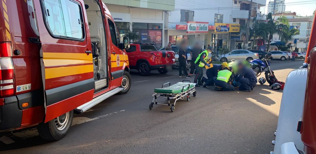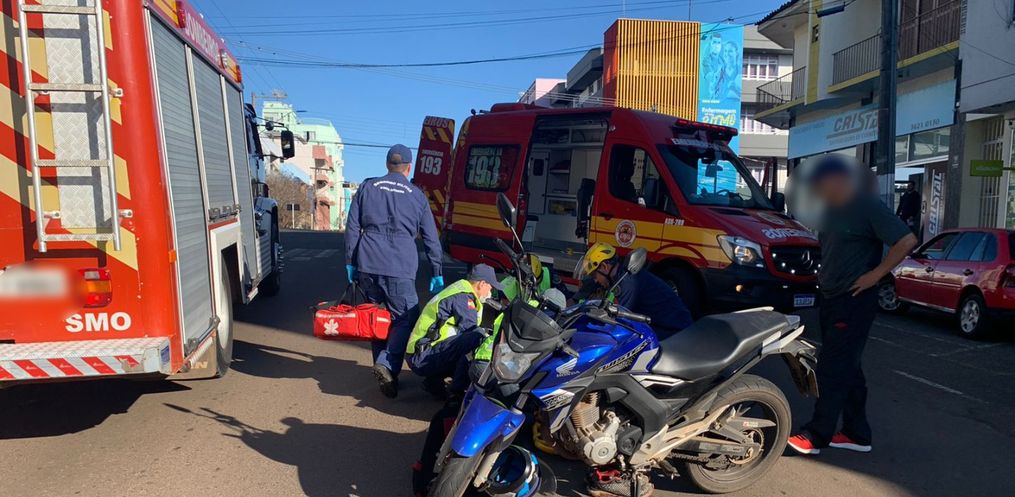 Uma colisão transversal deixou um motociclista ferido na tarde desta quarta-feira, 15, na Rua Santos Dumont, centro de São Miguel do Oeste.