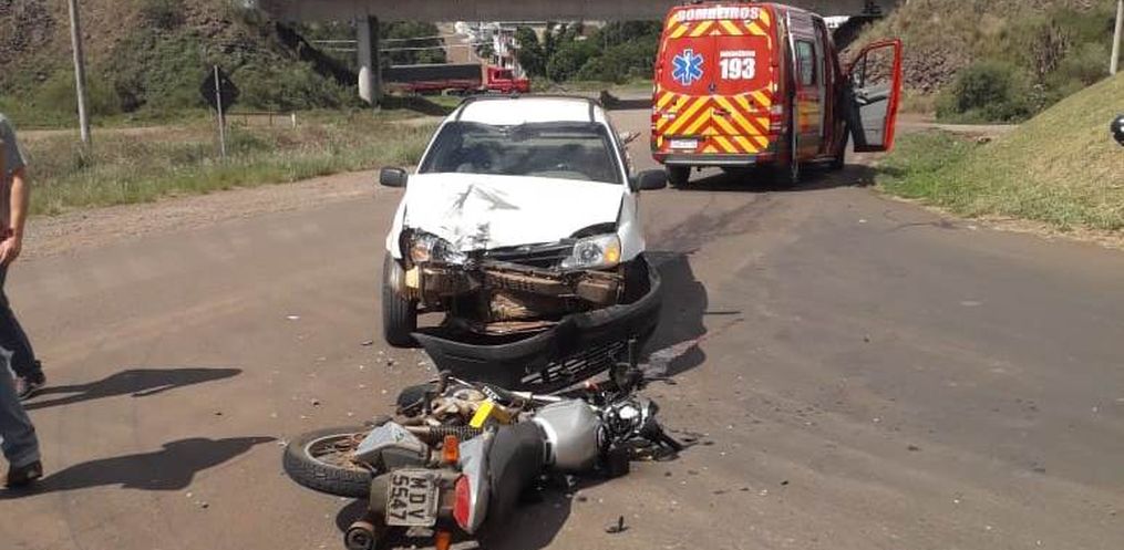 Os bombeiros atenderam o motociclista, de 23 anos, que apresentava escoriações nos membros inferiores, fratura na mão esquerda e possível fratura de costelas.