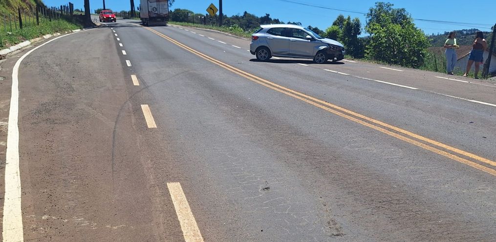 No local, a Polícia Militar Rodoviária confirmou o acidente envolvendo um Fiat Argo Drive 1.0, conduzido por um homem, e uma motocicleta Honda Biz 125, conduzida por uma mulher.