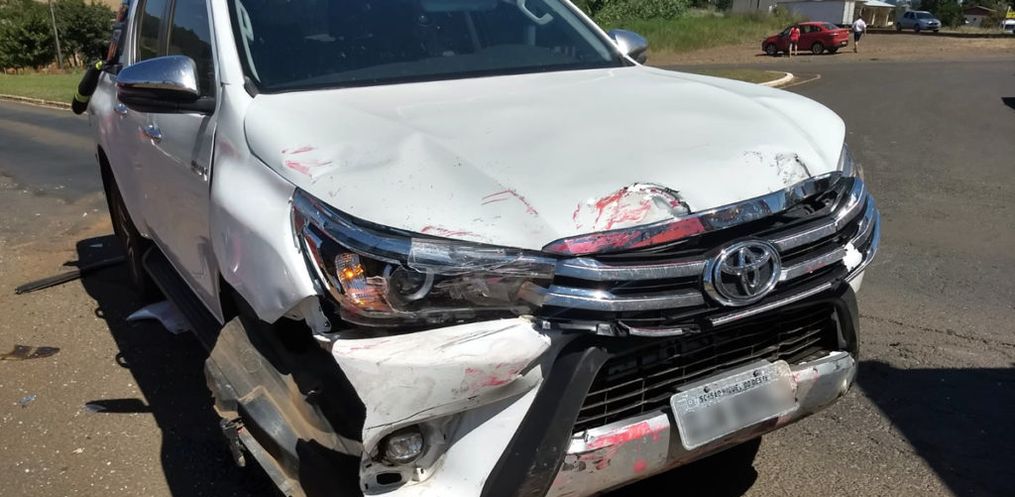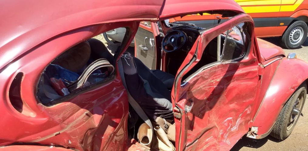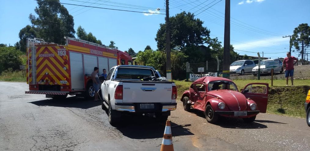 No local houve uma colisão lateral envolvendo uma camionete Hilux, de São Miguel do Oeste e um Fusca emplacado em São José do Cedro.