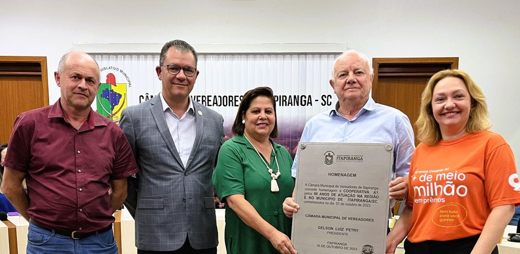 A Câmara de Vereadores de Itapiranga realizou na noite desta segunda-feira, 16, Sessão Solene em alusão aos 90 anos de atuação da Cooperativa A1 na região e no município de Itapiranga. A iniciativa foi da vereadora Ilda Teixeira Felller e aprovada em Plenário por todos os demais vereadores.