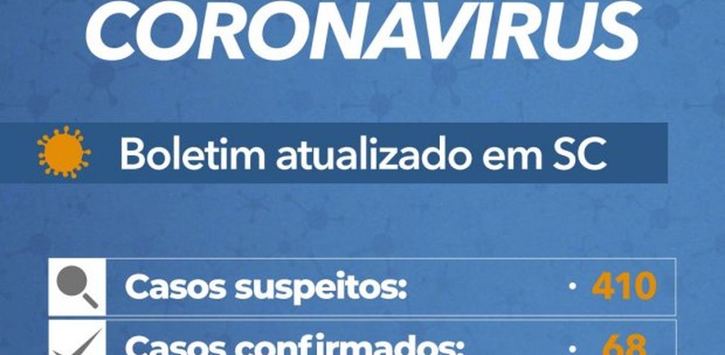 Santa Catarina tem 68 casos confirmados e 410 suspeitos do novo coronavírus, conforme o boletim divulgado pelo governador Carlos Moisés na noite deste domingo, 22.