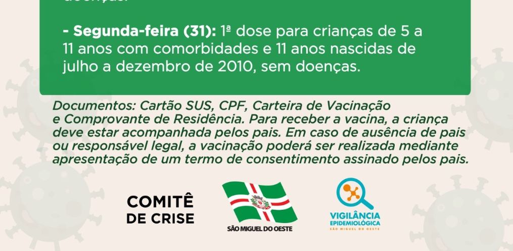 A Secretaria de Saúde de São Miguel do Oeste informa que irá dividir em dois dias a aplicação da 1ª dose da vacina contra covid para crianças de 11 anos, sem doenças, a fim de evitar aglomerações.