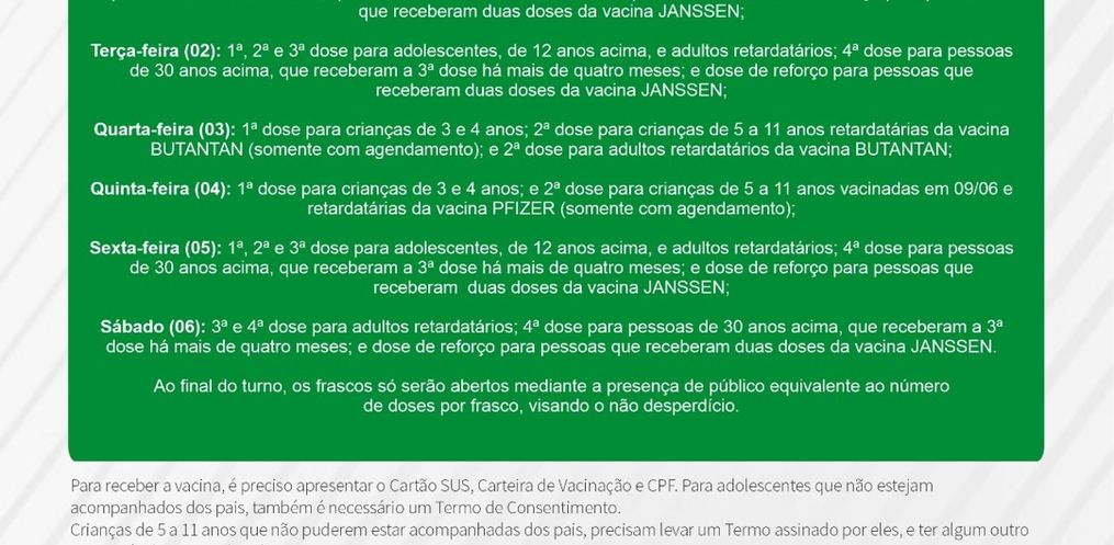 - Segunda-feira (01): 1ª, 2ª e 3ª dose para adolescentes, de 12 anos acima, e adultos retardatários; 4ª dose para pessoas de 30 anos acima, que receberam a 3ª dose há mais de quatro meses; e dose de reforço para pessoas que receberam duas doses da vacina JANSSEN;