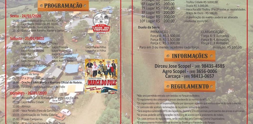 Segundo o patrão Dirceu Scopel, a programação inicia na sexta-feira, com laço individual e em dupla às 14h. Às 18h inscrição do Duelo da Serra e às 20h30 Gaitaço com Ramires Xavier e jantar.