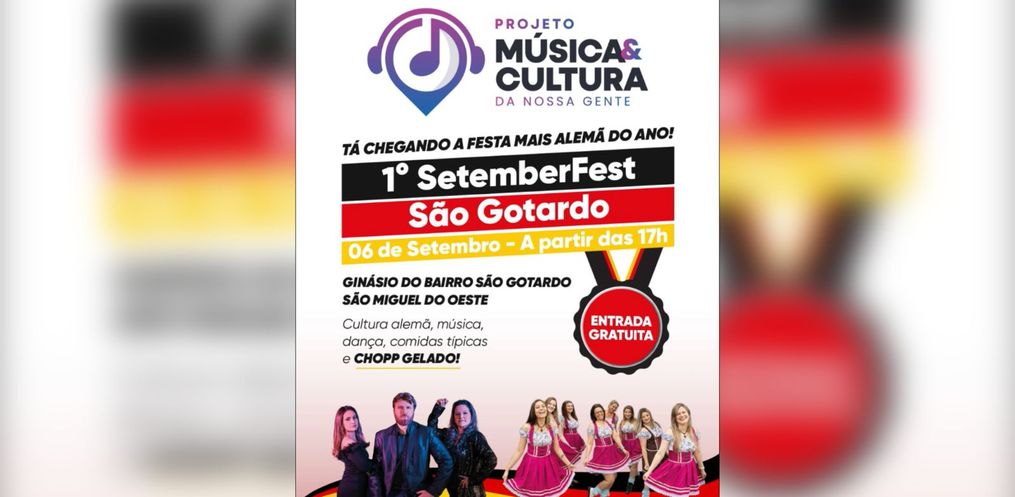 Inspirado na Oktoberfest, o bairro São Gotardo, em São Miguel do Oeste, recebe no dia 6 de setembro a primeira edição do Setemberfest, uma festa que valoriza a tradição alemã presente na região. A programação começa às 17h e inclui apresentações culturais, gastronomia típica e shows tudo com entrada gratuita.