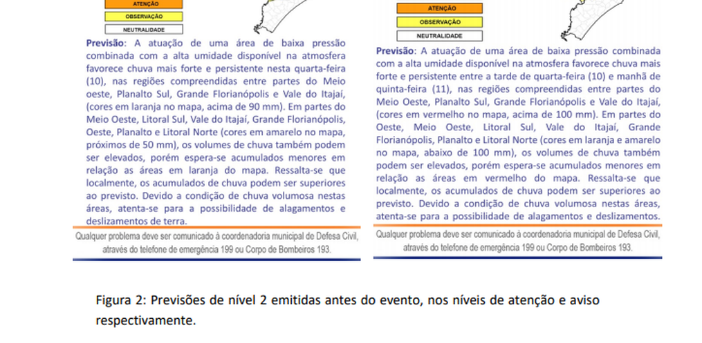 Nos dias seguintes, foram atualizadas diariamente os avisos meteorológicos, reforçando as condições para chuva forte e persistente no estado, indo do nível de observação até o nível mais alto de risco aviso no dia do evento.