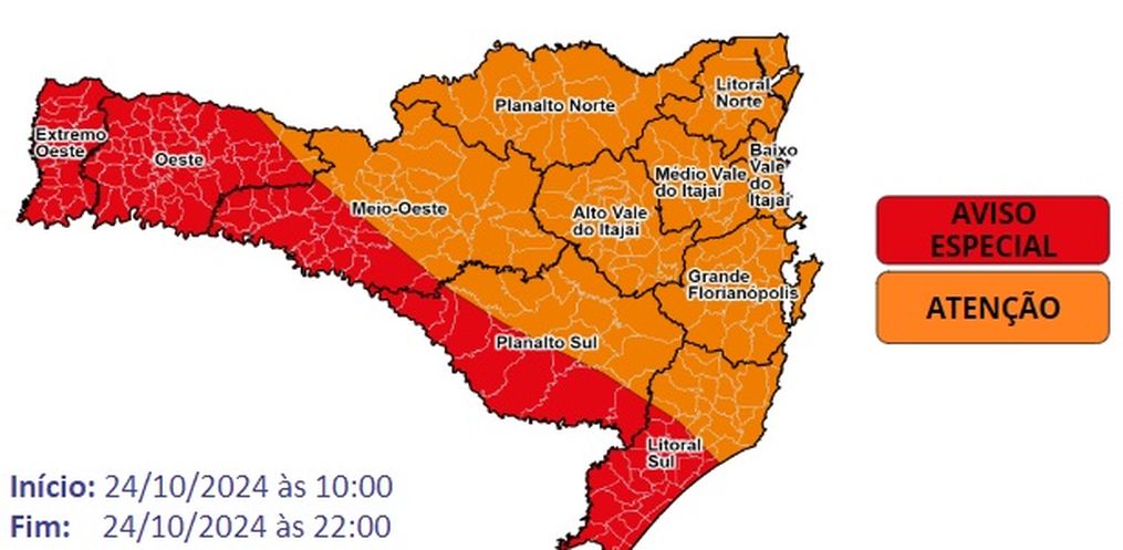 Os temporais devem começar no final da manhã, principalmente nas áreas próximas à fronteira com o Rio Grande do Sul e Argentina, avançando ao longo do dia para outras regiões. Uma Linha de Instabilidade (LI) pode causar tempestades severas, com risco muito alto de destelhamentos e quedas de árvores, especialmente nas áreas marcadas em vermelho pela Defesa Civil.