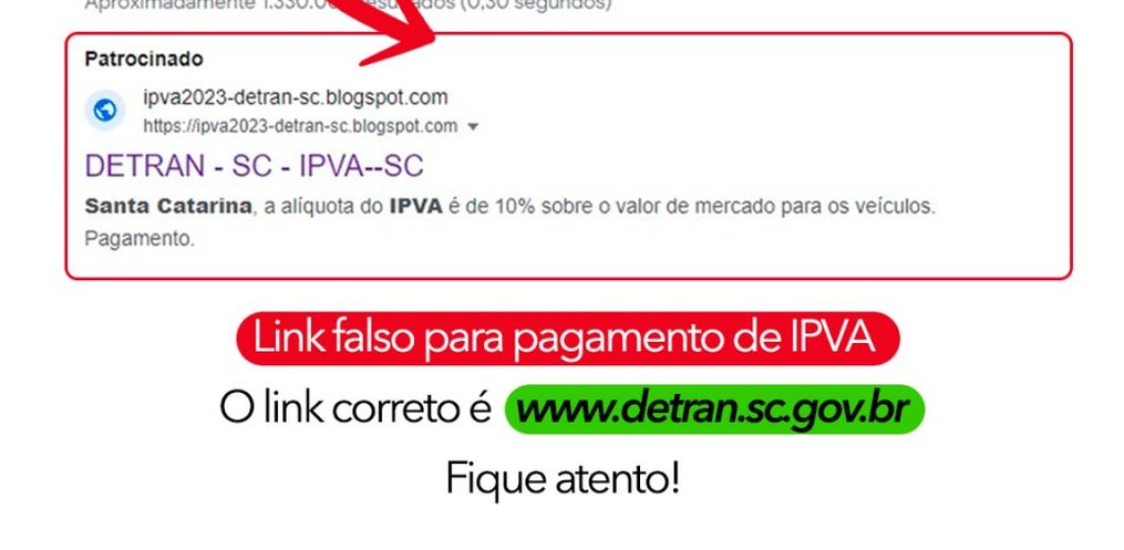 Além do site “fake”, existe um link patrocinado no Google. O link correto do Detran/SC é https://www.detran.sc.gov.br.
