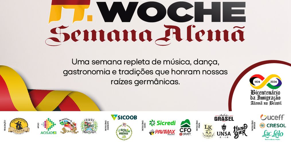 A 14ª edição da Semana Alemã terá a sua noite de abertura neste sábado, 20. A abertura está marcada para às 20 horas, no Ginásio Municipal. O tema do evento será o bicentenário da imigração alemã para o Brasil. Conforme o Coordenador, André Klunk, os moradores e funcionários estão organizando os últimos detalhes para receber os visitantes. A festa deste ano irá receber uma comitiva alemã. De acordo com Klunk a programação da Semana Alemã é extensa, com vários eventos, como baile da terceira idade, jantar típico e o desfile típico, no próximo sábado, 27, dia do encerramento. O Coordenador menciona que a abertura terá participação de diversas autoridades de destaque. Ele cita também que o evento conta também com inúmeros grupos folclóricos.