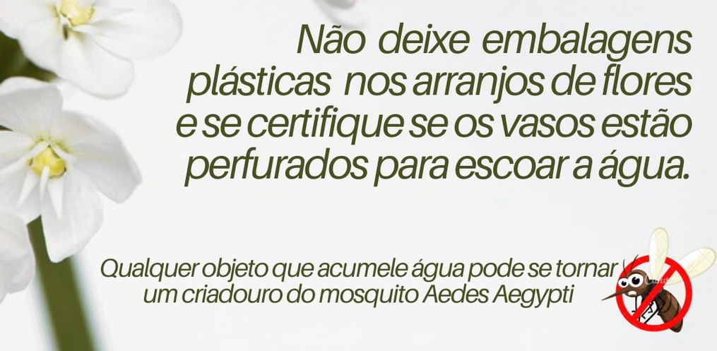 Outro recomendação é para que não sejam utilizados pratinhos nos vasos de flores ou que eles sejam furados e preenchidos com areia até a borda. O agente fiscal salientou que a Vigilância Sanitária fez um trabalho de orientação nos comércios da cidade, explicando sobre a legislação vigente, para que não fossem vendidos produtos envoltos em embalagem plástica.