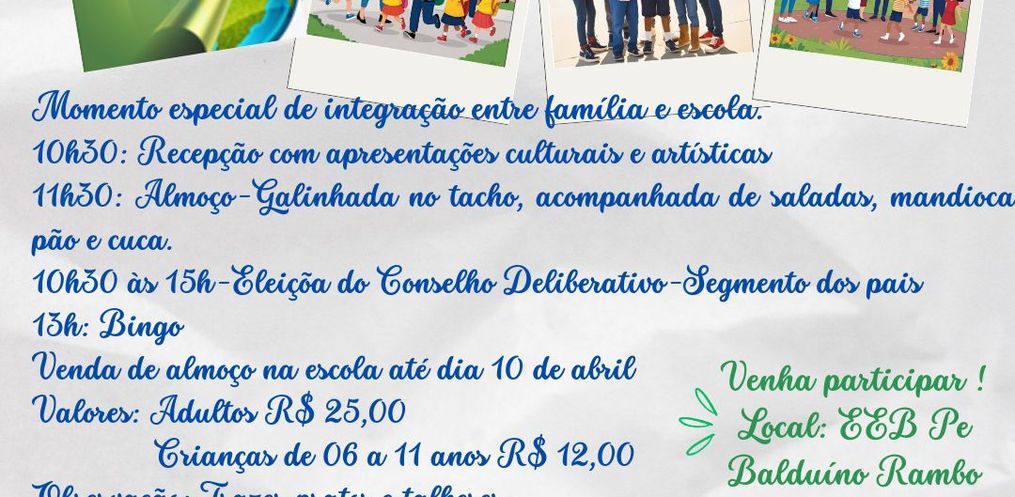 Em relação ao dia da família na escola neste sábado, 12, o diretor Renato Paulata salienta que o evento contará com uma programação cultural, iniciando às 10h30, com apresentações e exposições dos trabalhos desenvolvidos pelos estudantes durante os primeiros meses de aula. Às 11h30, será servido um almoço, com uma tradicional galinhada no tacho.