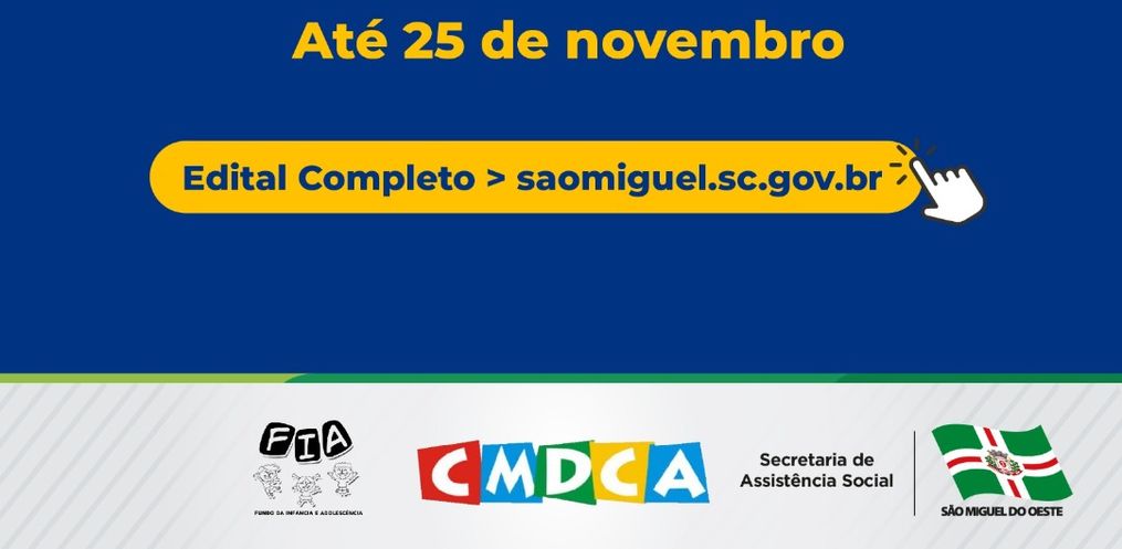 A inscrição de projetos deverá ser feita até o dia 25 de novembro, no protocolo eletrônico do Município, por meio do site www.saomiguel.sc.gov.br. O edital na íntegra também pode ser acessado no link Edital FIA.