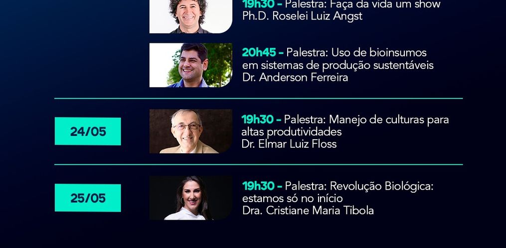 Na quarta-feira, 24, às 19h30min terá palestra sobre "Manejo de culturas para altas produtividades" com Elmar Floss. O encerramento será na quinta-feira, 25, com palestra sobre "Revolução Biológica: estamos só no início", com Cristiane Tibola.