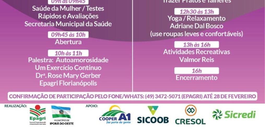 Valmor Reis destaca que o objetivo do evento é valorizar a classe das mulheres e atrair uma maior participação delas em eventos do município. A confirmação de participação deve ser feita até o dia 01 de março com os agentes de saúde, no Cras, Epagri ou nas cooperativas parceiras: Cooper A1, Cresol, Sicoob e Sicredi.