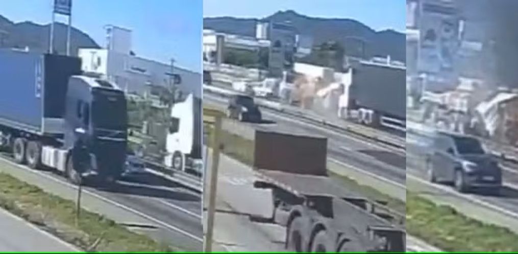 Imagens divulgadas nas redes sociais, e com a veracidade confirmada pela Arteris Litoral Sul, flagraram o momento da colisão. É possível ver quando um dos caminhões atinge e prensa os veículos que estavam parados no congestionamento.