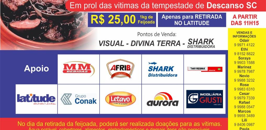 No caso dos interessados de Descanso, as fichas estarão disponíveis na Padaria Cantinho Doce. Já nos demais casos, as fichas são entregues pessoalmente nas residências ou mesmo com os organizadores da Feijoada Solidária.