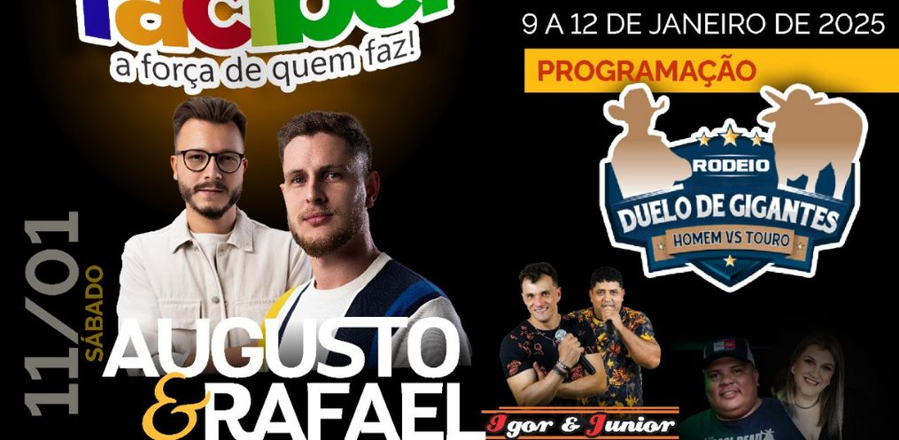 Já no sábado, 11, o público poderá conferir apresentações das oficinas culturais, música ao vivo e mais uma noite de rodeio, fechando com um show da dupla Augusto e Rafael. O encerramento no domingo, 12, será marcado por atividades voltadas ao público infantil, shows tradicionais e a final do rodeio.