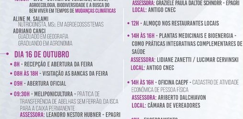 A programação deve iniciar às 8h da manhã com encerramento programado para às 18h. Dentro do cronograma, o município planejou a intenção de realizar algumas oficinas com profissionais da Epagri e de outras entidades. A abertura acontece no Centro de Convivência de Idosos de Anchieta.