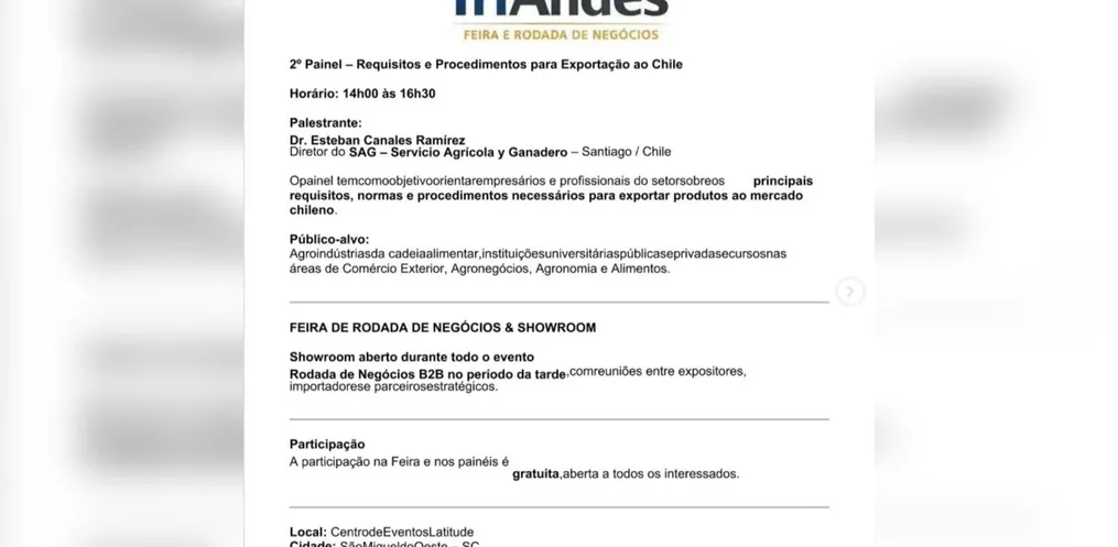 Organizada pelo empresário Darci Zanotelli, a Feira Triandes é gratuita e aberta ao público. A expectativa é que o evento fortaleça a economia regional, amplie relações comerciais e coloque São Miguel do Oeste em evidência no cenário internacional de negócios.