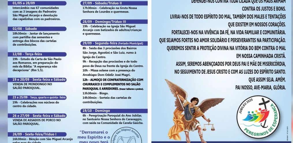 29 de setembro (segunda-feira) – Missa festiva às 10h, presidida por Dom Odelir José Magri, seguida de almoço com churrasco de gado e suíno, além de acompanhamentos como saladas, pão, cuca e sobremesas feitas por voluntárias da paróquia.