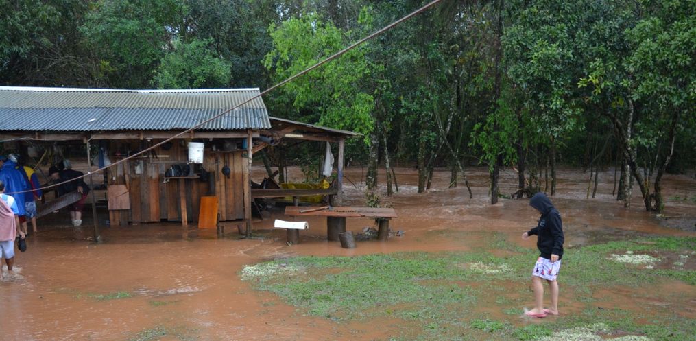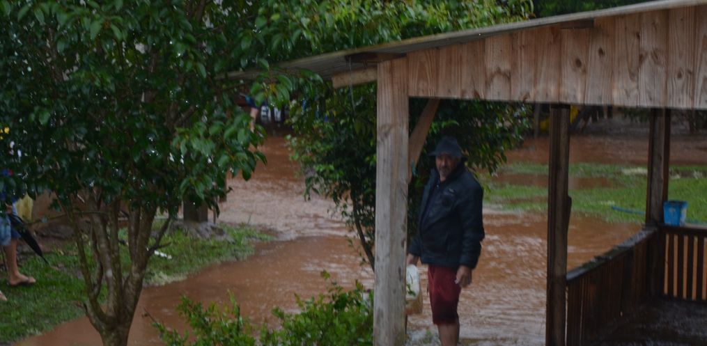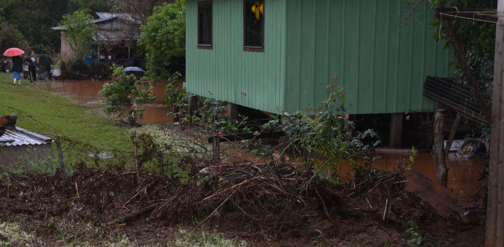 Na manhã desta terça-feira, 11, os registros aumentaram e a água dos rios acabou invadindo várias residências. Na comunidade de Três Voltas, cerca de quatro famílias tiveram que sair de suas residências por conta do alagamento. Odirlei da Silva, moradora do local, conta que quando acordou só deu tempo de tirar as crianças menores do quarto, e a água invadiu a residência, levando embora com a correnteza roupas e outros utensílios da família.