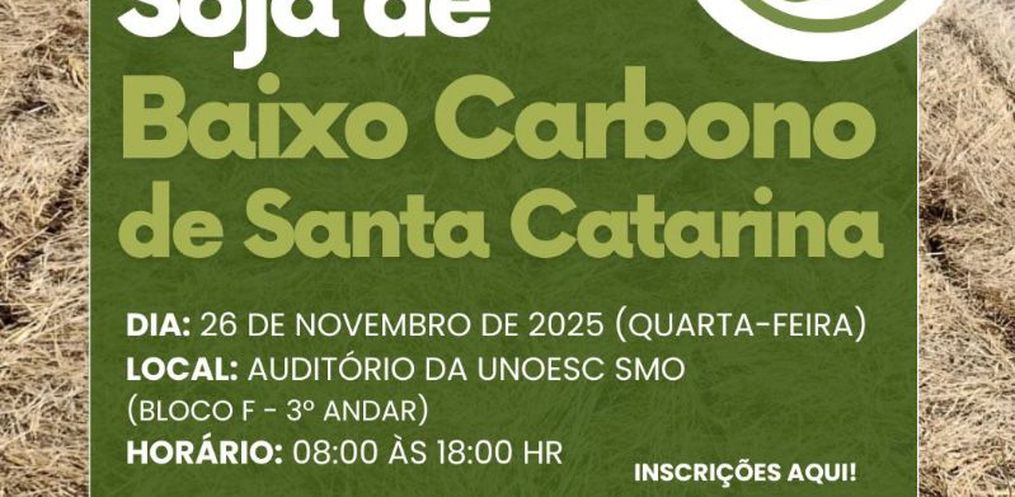 O Primeiro Fórum Soja de Baixo Carbono de Santa Catarina será realizado nesta quarta-feira, 26, no auditótio da Unoesc de São Miguel do Oeste. O encontro, organizado pela Associação dos Engenheiros Agrônomos do Extremo Oeste Catarinense em parceria com a Epagri, Unoesc e Feagro, pretende difundir o Programa Soja de Baixo Carbono, desenvolvido pela Embrapa Soja de Londrina após anos de pesquisa.