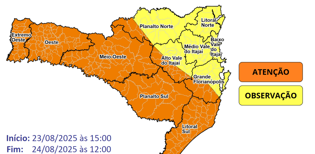O sábado ainda será quente em cidades do Vale do Itajaí, Litoral Norte e parte da Grande Florianópolis. Mas entre a tarde e a noite, o ar frio começa a avançar, derrubando rapidamente as temperaturas, especialmente no Grande Oeste, Planalto Sul, Litoral Sul e na região serrana da Grande Florianópolis, onde os termômetros podem marcar entre 5°C e 10°C já no fim da noite.