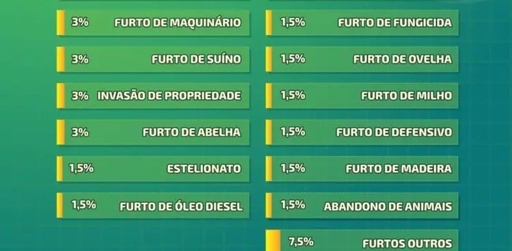 O levantamento é do Centro Estadual de Apoio Operacional de Combate aos Crimes Contra o Agronegócio da Polícia Civil e a divisão especializada ainda identificou ocorrência significativa do crime de dano, presente em 7,5% dos boletins registrados.