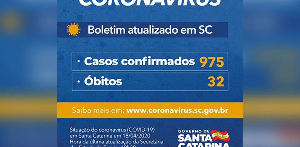 O número de pessoas infectadas pelo novo coronavírus em Santa Catarina chegou a 975 na manhã deste sábado, 18. O Estado também registrou mais um óbito, de uma mulher de 81 anos, em Balneário Camboriú, e totaliza 32 mortes por Covid-19. O número foi divulgado pelo governador Carlos Moisés, durante coletiva de imprensa online, e consta no boletim epidemiológico diário publicado pelo Governo do Estado.