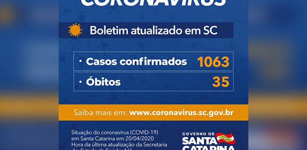 Santa Catarina tem 1.063 pacientes com teste positivo para Covid-19. O dado foi divulgado pelo governador Carlos Moisés em entrevista coletiva nesta segunda-feira, 20. A doença respiratória já causou 35 mortes no estado desde o início da pandemia.
