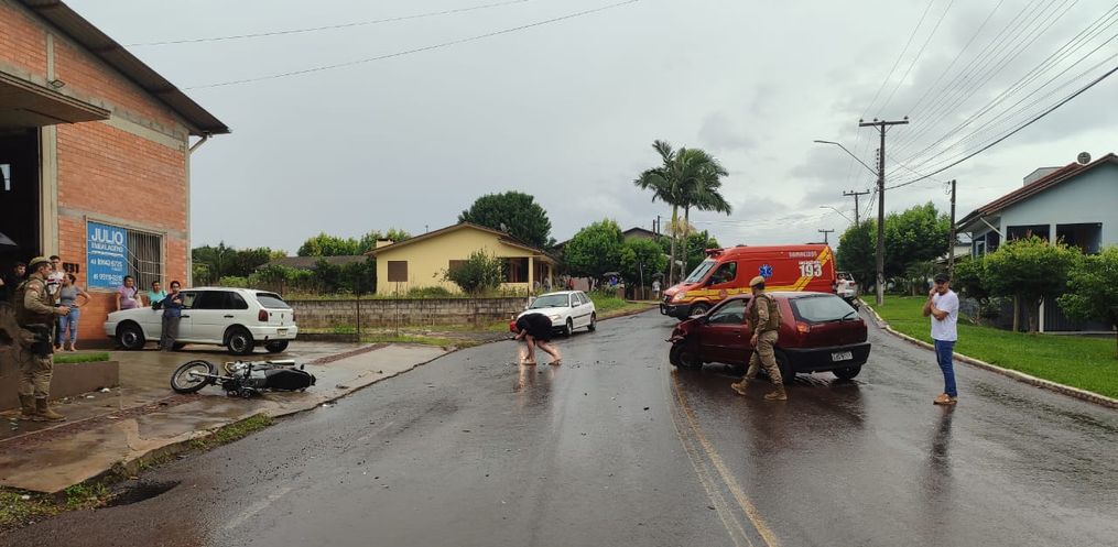 Na tarde desta segunda-feira, 22, por volta das 13h20, um acidente de trânsito entre um carro e uma motocicleta deixou um homem gravemente ferido na Rua Duque de Caxias, no Bairro Bartz, em Cunhã Porã.
